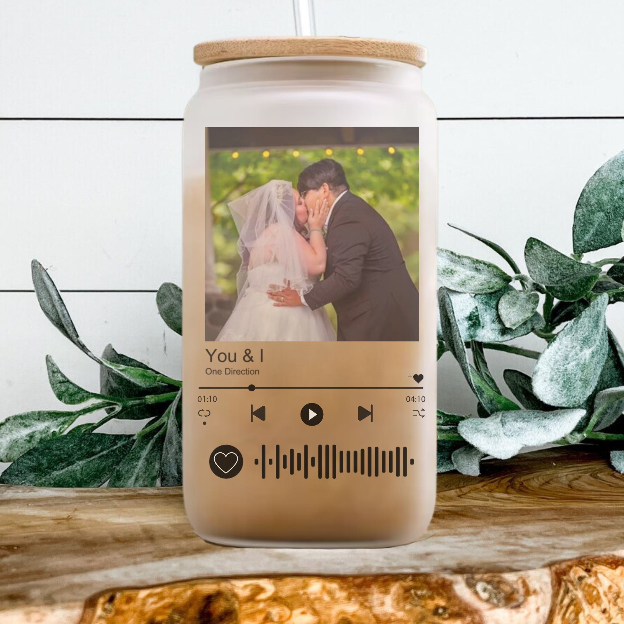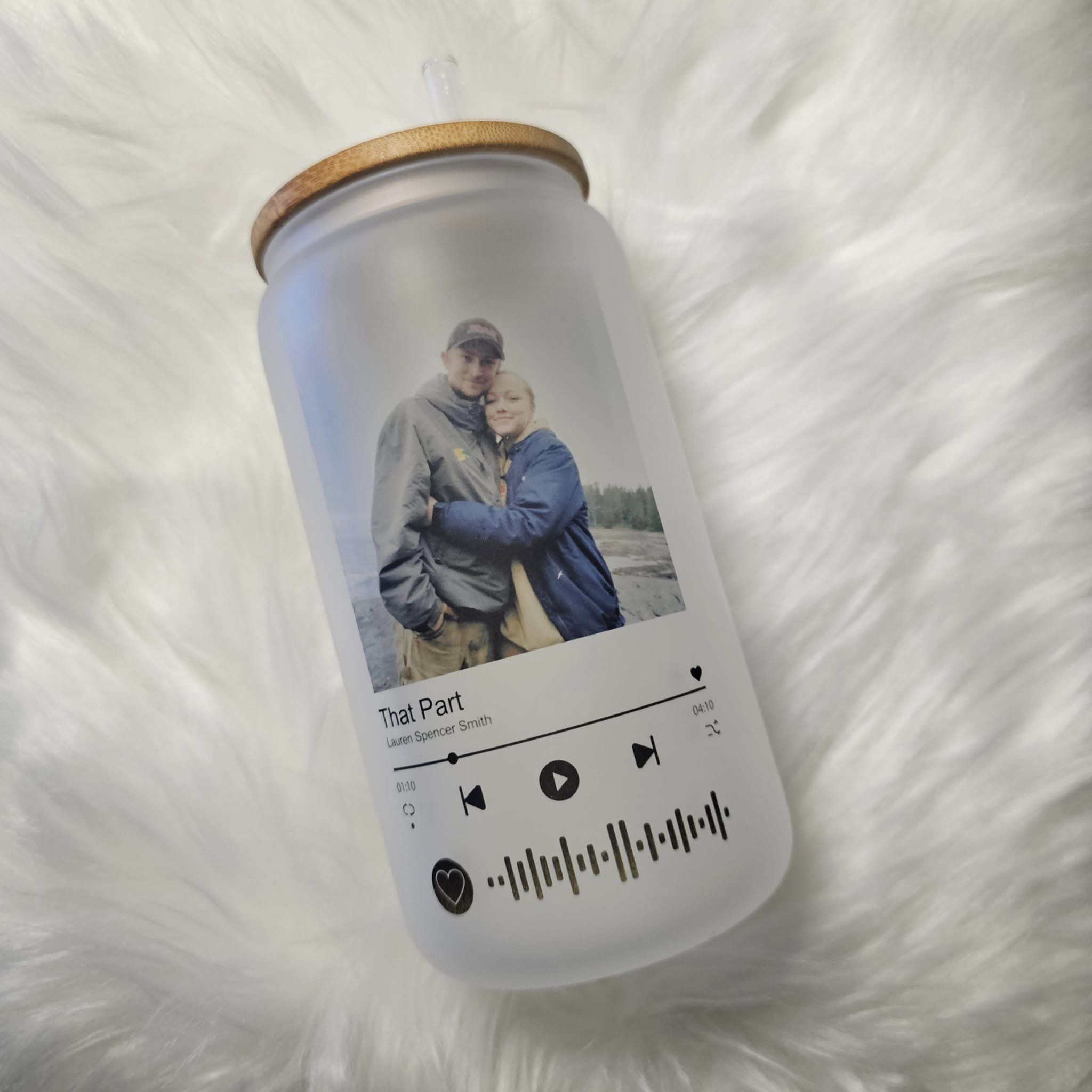 Enjoy the perfect cup of iced coffee in style with our Frosted 16oz Glass Libby Cup. This frosted glass cup is built to last, with a bamboo lid and glass straw to enjoy your favourite drink. Our unique frosted glass adds a touch of colour and fun to your morning routine. Relax and refresh! The Spotify code on the bottom actually works to open the song on your phone!