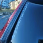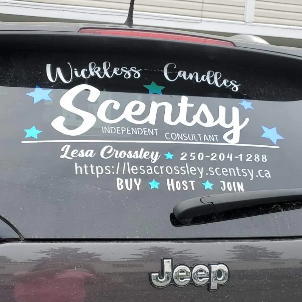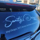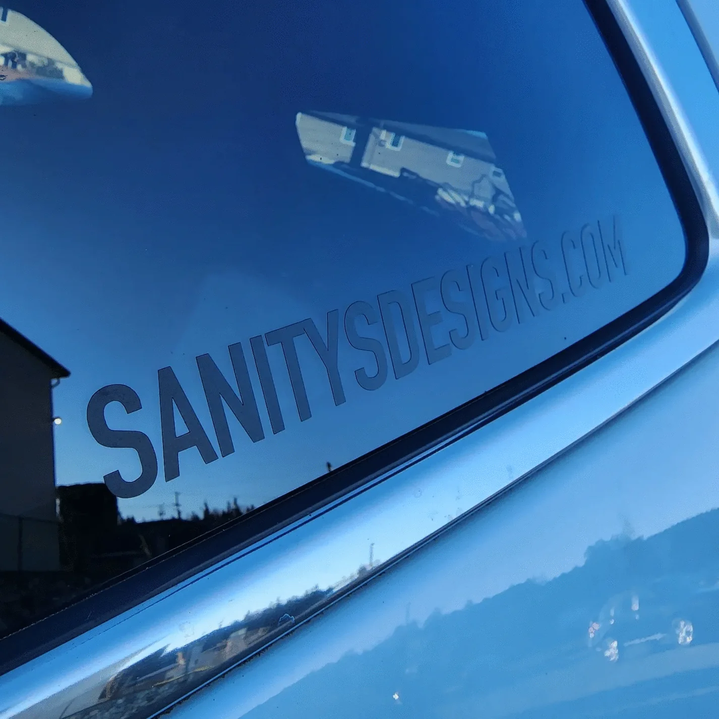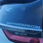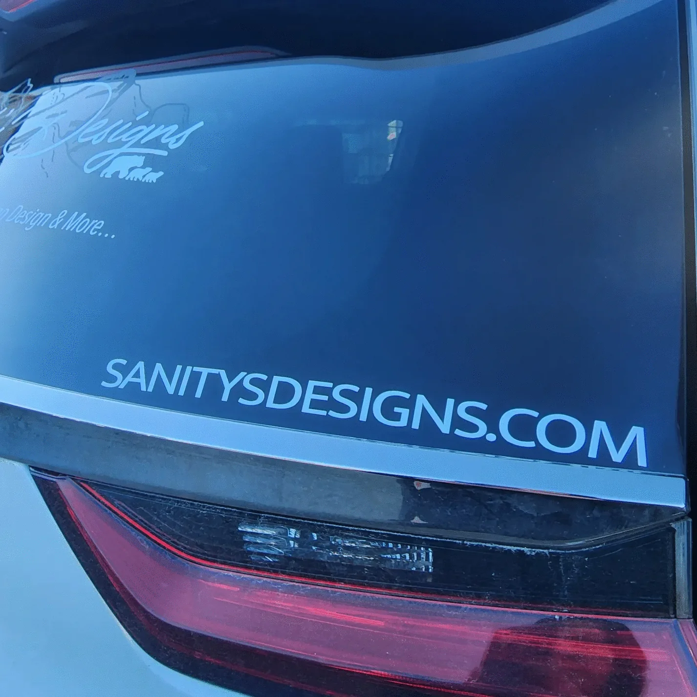 Custom made business decal made for a rear window at approximately 23”, but depends on your logo. The “Sanity’s Designs” decal pictured is 23” long on an SUV. Decals are made in white unless requested otherwise. Matte Black is a nice option if you’re looking for a subtle look. Our mountains and some of our business tags are matte black in our photos. They can be put on doors as well, but long use may effect paint*