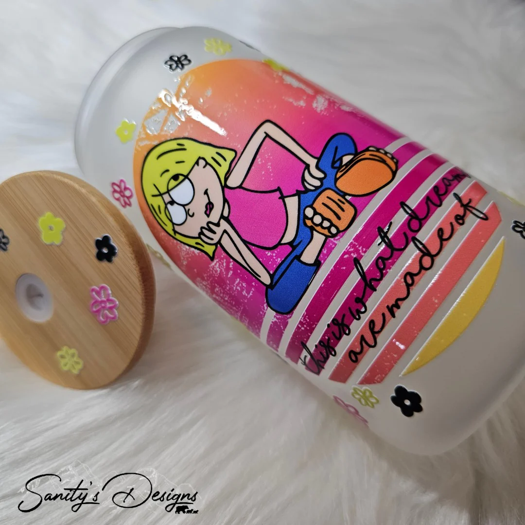 Enjoy the perfect cup of iced coffee in style with our Frosted 16oz Glass Libby Cup, This is what dreams our made of with Lizzy’s Cartoon! This frosted glass cup is built to last, with a bamboo lid and plastic straw to enjoy your favourite drink. Our unique frosted glass adds a touch of colour and fun to your morning routine. Relax and refresh!