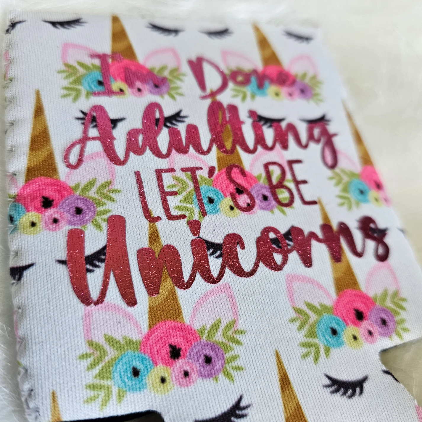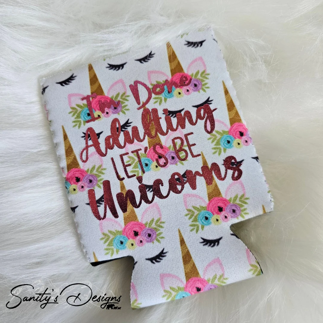Take your adulting fatigue and shield your drink with this I’m Done Adulting Let’s Be Unicorns Koozie!