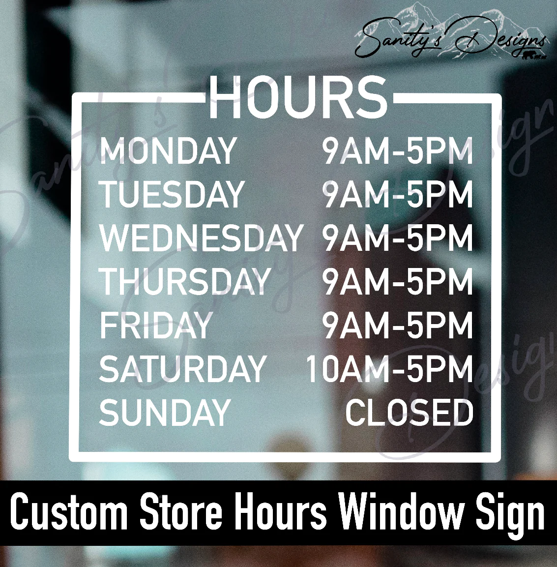 Please write out what hours you would like on your sign in the custom text box below. If you’d prefer to send an email, please do so to sanitysdesigns@gmail.com with your store hours after your purchase. Make sure to include your order number.